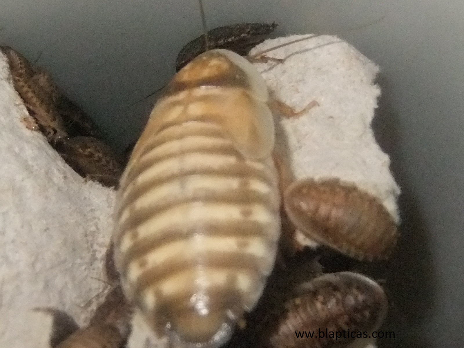 La hembra de blaptica dubia al llegar a adulta está preparada sexualmente y saca la ooteca paseándose con ella fuera.